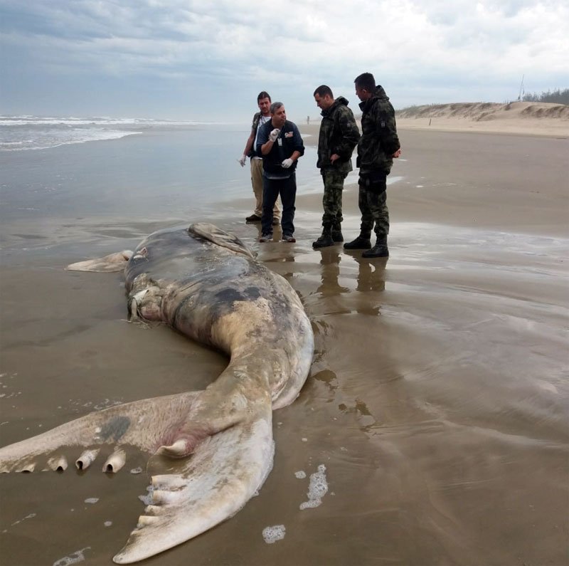 O biólogo do museu, Rodrigo Ribeiro de Freitas, e o bolsista, Murilo Dal-Toé, constataram o nível de decomposição alta e coletaram amostras de tecido e gordura para análise.